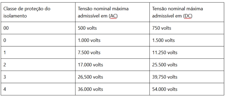 A classe de proteção de isolamento do equipamento de proteção individual (EPI) é determinada de acordo com a tensão nominal da instalação, sendo calculadas tanto a tensão nominal máxima admissível em (AC) como a tensão nominal em (DC).