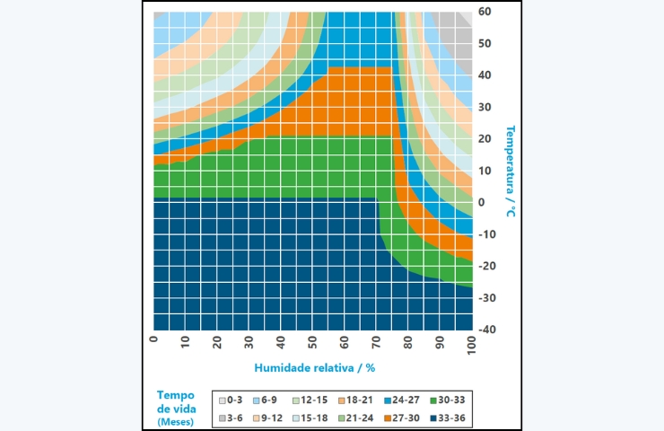 Até cerca de 70% de humidade relativa, a temperatura ambiente é o fator determinante para a vida útil de um sensor. Acima deste ponto, a vida útil torna-se desproporcionadamente dependente da humidade do ar.