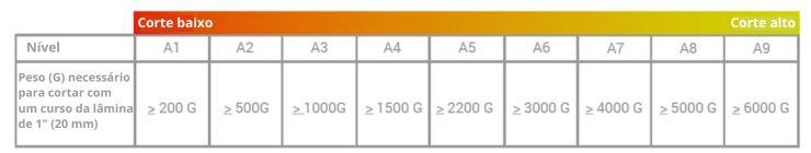 Após cada corte, uma nova lâmina é posicionada na máquina de teste e é adicionado peso (em gramas) até que o corte seja efetuado. Quando o corte ocorre, é estabelecido um intervalo de teste com vários outros cortes efetuados com pesos diferentes.