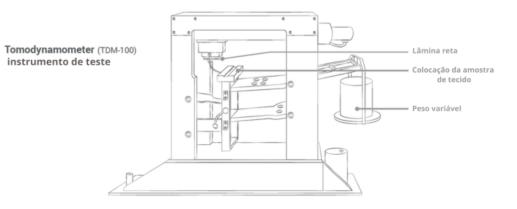 Como funciona o teste: Com o TDM-100, o tecido de teste recebe vários cortes, todos numa direção e comprimento uniformes que podem variar de 5 mm a 50 mm, mas 20 mm é a distância alvo para o corte.