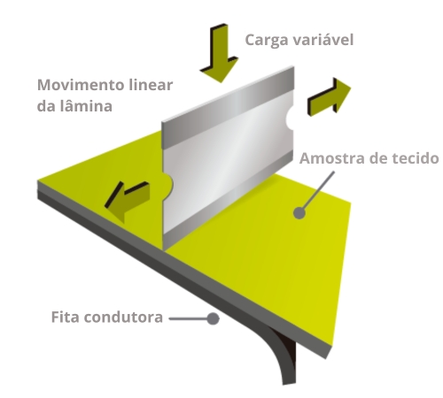 A carga ou peso, e a distância necessária para cortar o tecido, ilustrada numa linha curva, é então efetuada para determinar a pontuação em gramas ou o peso necessário para conseguir cortar o tecido a 20 mm.