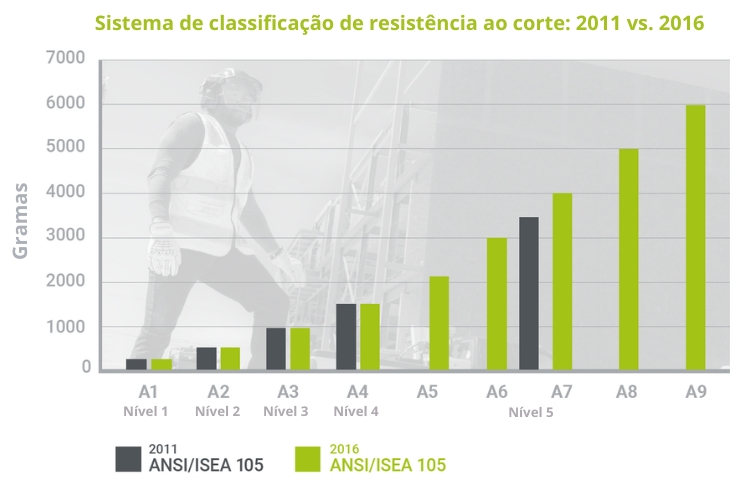 A versão de 2016 aborda as lacunas entre os níveis de corte, fornece uma identificação mais precisa da proteção oferecida e permite que os utilizadores finais identifiquem com maior precisão um nível de resistência ao corte que satisfaça uma necessidade específica. O gráfico mostra os níveis alargados de resistência ao corte adotados pela ANSI/ISEA 105-2016.