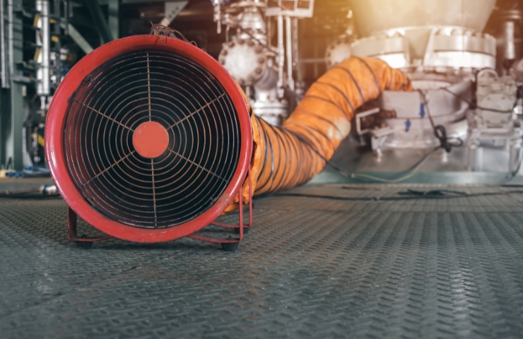 Também deve haver ventilação adequada, como ventoinhas e sistemas de arrefecimento, que podem ser utilizados para aumentar o fluxo de ar num espaço pequeno. Em espaços com gases tóxicos onde não é possível utilizar ventoinhas, os trabalhadores podem necessitar de pacotes de arrefecimento e toalhas.