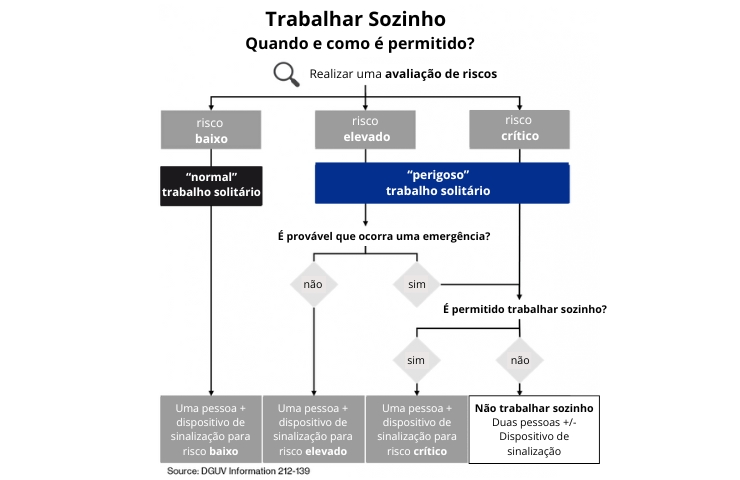 De acordo com o Artigo 8 da Regulamentação DGUV 1 “Princípios de Prevenção”, os empregadores têm a obrigação de implementar medidas técnicas ou organizacionais adequadas de proteção pessoal, além das precauções gerais de segurança, quando tarefas perigosas são realizadas em trabalho isolado.
